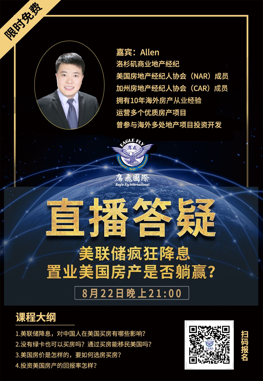 8月22日晚9點,鷹飛國際聯(lián)合美國金牌商業(yè)地產(chǎn)經(jīng)紀Allen,為大家就美國房產(chǎn)問題答疑解惑!